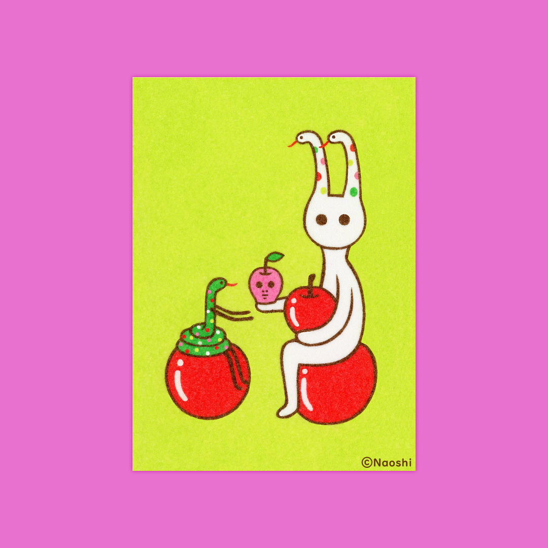 Sharing is caring, especially when you're giving an apple with a face to a snake with legs.