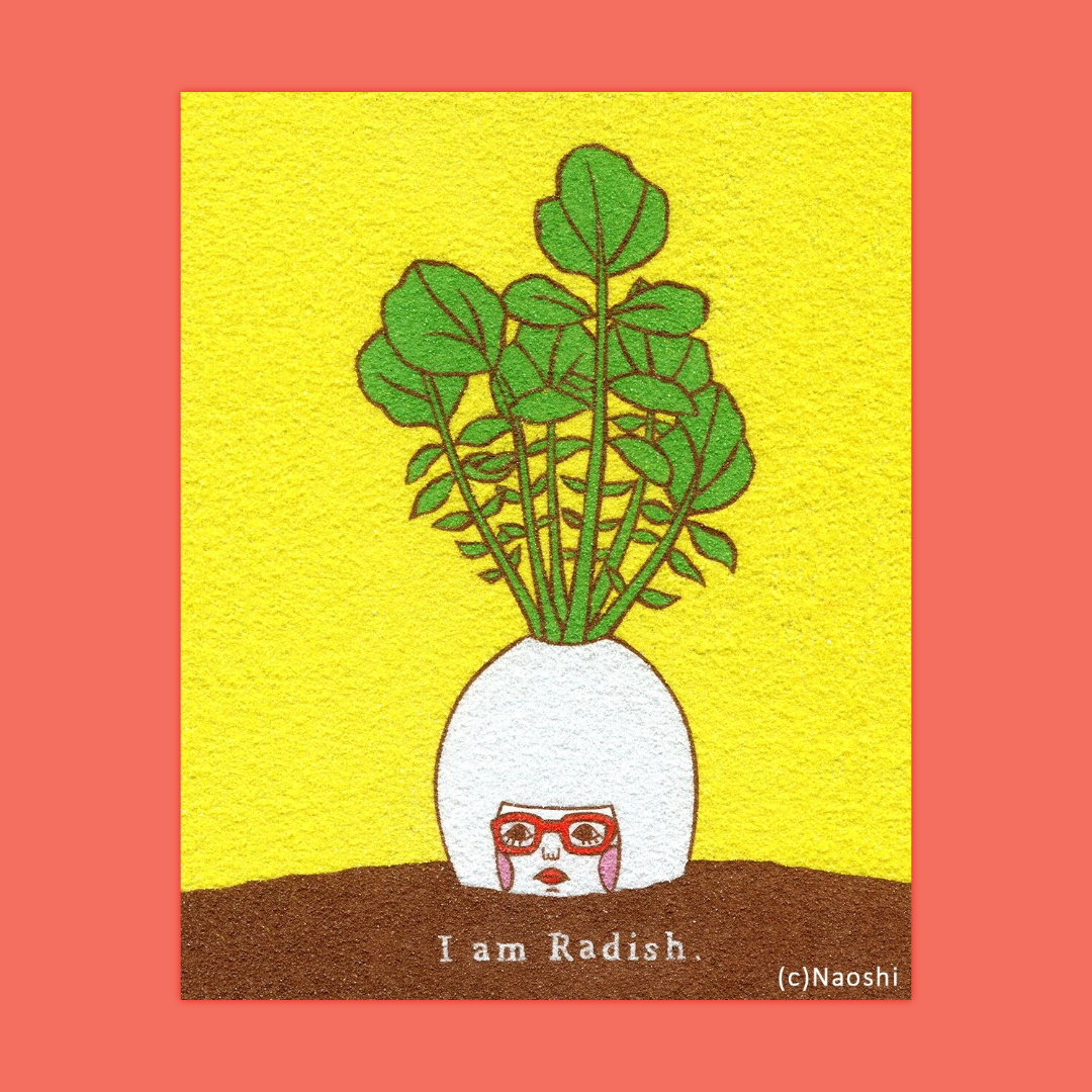 This is a reproduction of Naoshi's original SUNAE (sand art) piece "I am Radish" and features the soft, sandy, original texture.