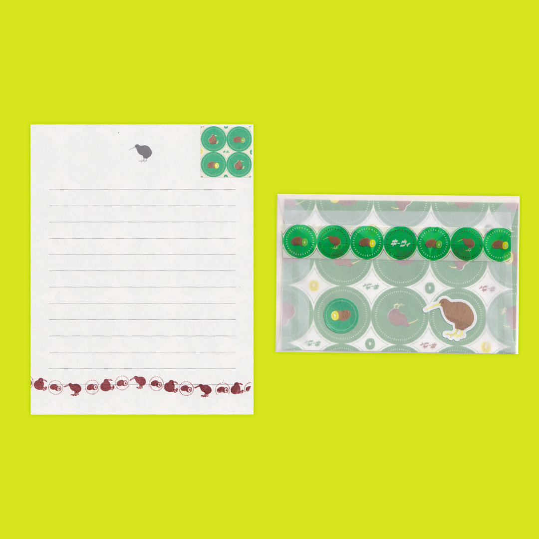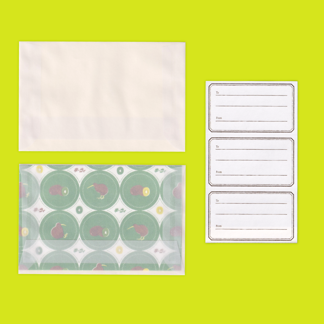 This set contains 6 sheets of letterhead paper with a shoebill pattern on one side, and ruled lines on the other for your message. The envelopes are made with translucent tracing paper so you can see the charming pattern when the letterhead is folded inside. This set also comes with address stickers that are stamped with gold foil to give your letter an extra special touch.