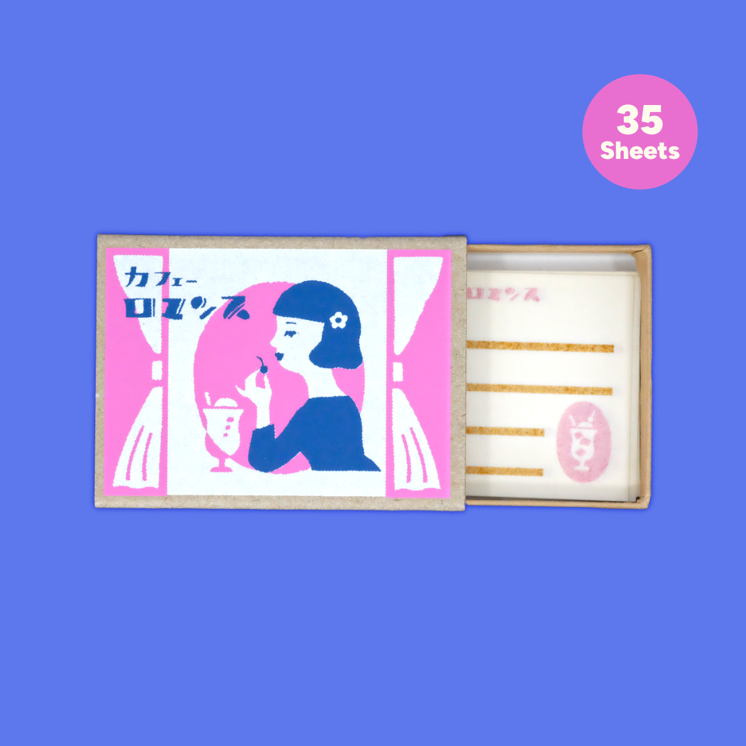 Is it a matchbox? Is it stationery? This retro diary mini memo set looks like a matchbox from a an ice cream parlor. The letter paper inside is traditional mino Japanese paper with a match pattern to create ruled lines. The box is silk printed to give it its vivd colors and can be used as a container for tiny items once you have finished using the notes. It is just the right size for writing a small message, and can be carried in a bag or given as a gift.