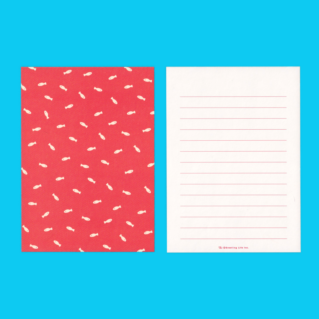 3 sheets of letterhead 10cm x 14cm | 3 sheets of die-cut letterhead 10cm x 14cm | 3 window envelopes 10cm x 14cm | 3 fish stickers