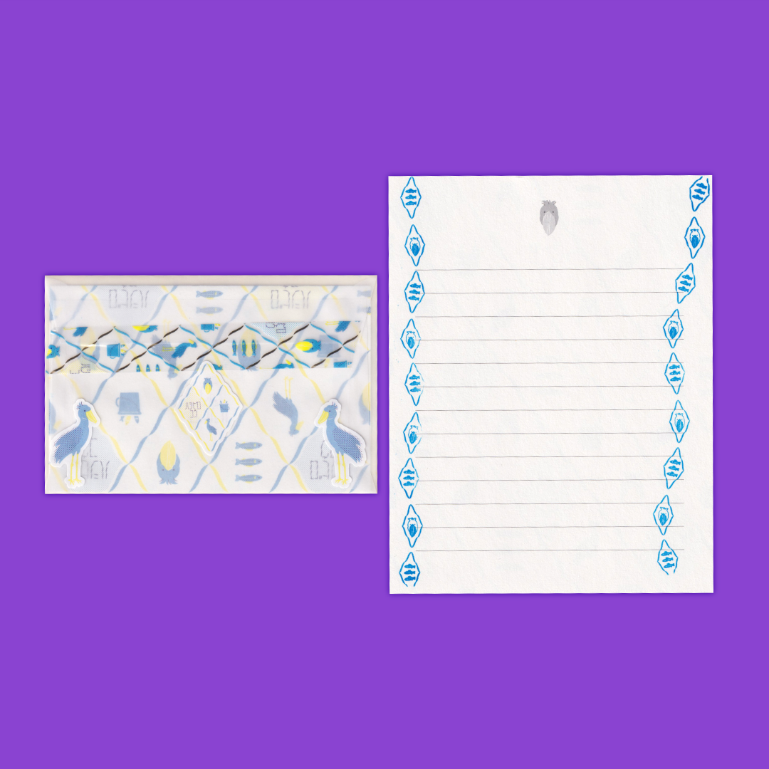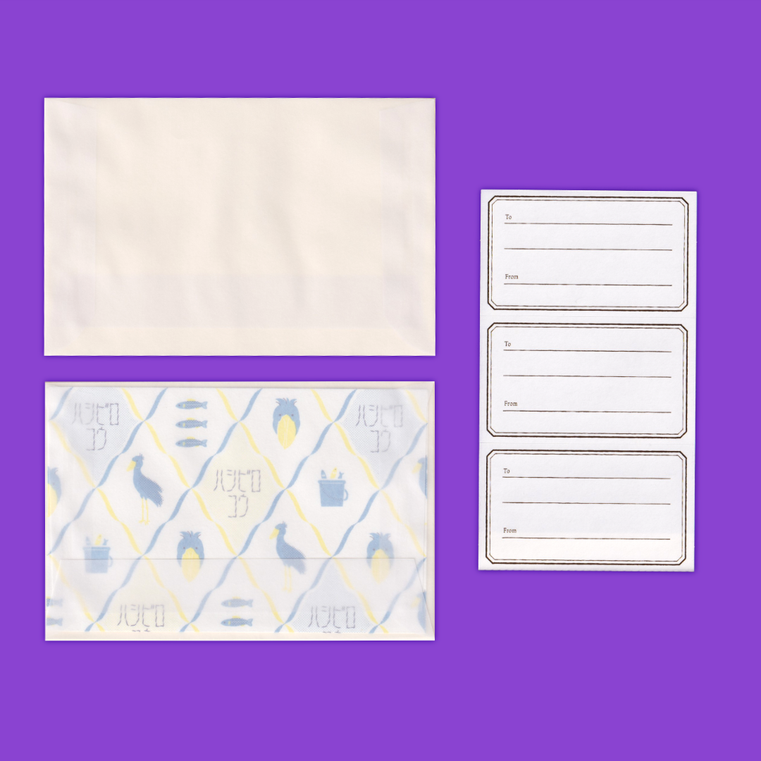 This set contains 6 sheets of letterhead paper with a shoebill pattern on one side, and ruled lines on the other for your message. The envelopes are made with translucent tracing paper so you can see the charming pattern when the letterhead is folded inside. This set also comes with address stickers that are stamped with gold foil to give your letter an extra special touch.